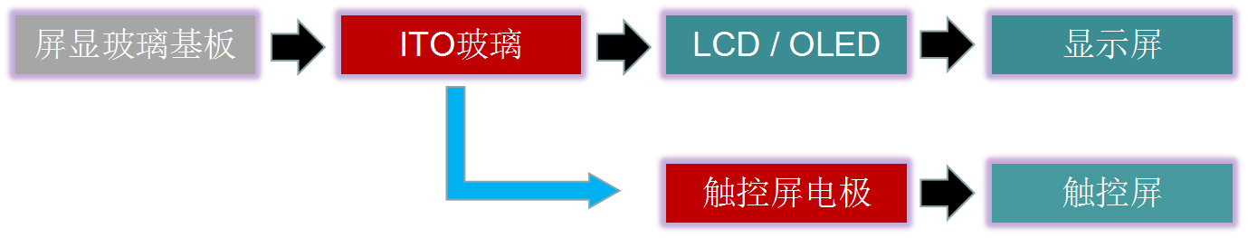 ITO下游產(chǎn)業(yè)主要是平板顯示產(chǎn)業(yè)中的導電玻璃技術(shù),即在鈉鈣基或硅硼基基片玻璃的基礎(chǔ)上,鍍上一層氧化銦錫膜加工制作成的。在平板顯示產(chǎn)業(yè)中應用在觸摸屏和液晶面板領(lǐng)域。觸摸屏領(lǐng)域應用的是TP-ITO導電玻璃,而液晶面板領(lǐng)域應用的是LCD-ITO導電玻璃,兩者的主要區(qū)別在LCD-ITO導電玻璃還會在鍍ITO層之前,鍍上一層二氧化硅阻擋層,以阻止基片玻璃上的鈉離子向盒內(nèi)液晶里擴散。