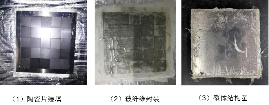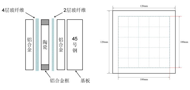 靶板從左到右依次為鋁合金面板、4層玻纖布、鋁合金邊框及陶瓷片、2層玻纖布、鋁合金背板、45號鋼基板。采用鋁合金邊框?qū)μ沾蓧K進行二維約束,再將玻纖布平鋪在陶瓷層的正面和背面(正面鋪上四層玻纖布、背面鋪上兩層玻纖布),正面與背面再用鋁合金板密封,使用聚氨酯膠黏劑將整個結(jié)構(gòu)在常溫下固化成型為復(fù)合裝甲陶瓷結(jié)構(gòu)件。