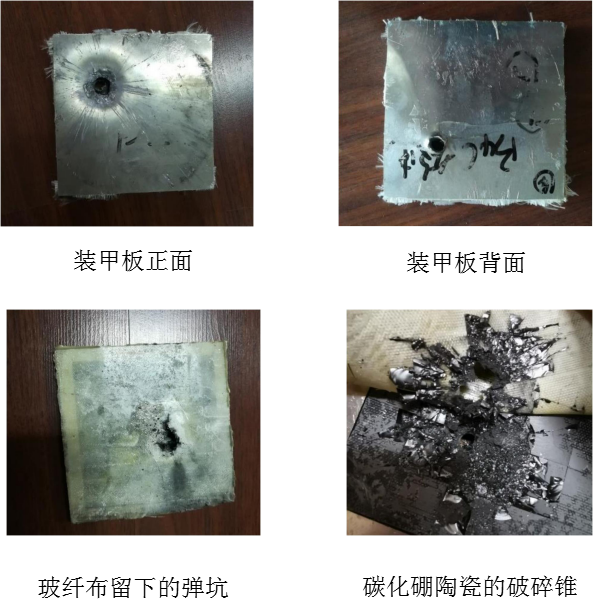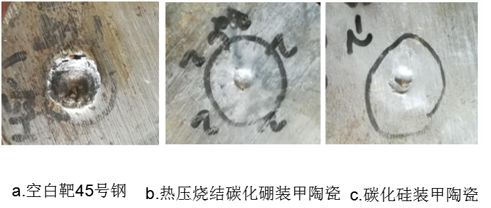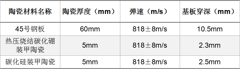 測試中,采用空白靶最對比,85式7.62毫米狙擊步槍對45號鋼的垂直侵徹深度為10.5mm,以此作為陶瓷復(fù)合裝甲的抗彈性能評判標(biāo)準(zhǔn)。對熱壓碳化硼裝甲片、碳化硅裝甲片進行抗彈性能進行評估。